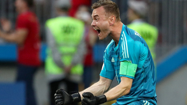 Сборная России выбрала оборонительную модель игры. Испанцы нанесли 19 ударов по воротам Акинфеева, 13 из которых были в створ, но вратарь справился со всеми, кроме предательского автогола от ноги Сергея Игнашевича на 12-й минуте. В концовке первого тайма Артем Дзюба сравнял счет, реализовав пенальти. В дальнейшем ни одна команда не отличилась ни в основное время, ни в дополнительное. Началась серия пенальти, с которой лучше справились россияне: все четыре удара оказались точными. Акинфеев сначала отразил удар Коке, а затем совершил свой самый знаменитый сэйв в карьере, переиграв Яго Аспаса. После этого заполненные «Лужники» погрузились в праздничное безумие, а вслед за ними и вся Россия.