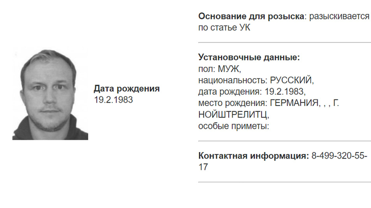В карточке указано, что разыскиваемый Алексей Блиновский родился 19 февраля 1983 г. в Германии. В его отношении возбуждено уголовное дело, статья не уточняется.