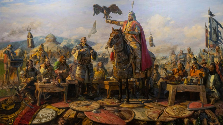 Пир монгольских военачальников Чингисхана во главе с Джэбэ и Субэдэем после победы над объединенным русско-половецким воинством на Калке 31 мая 1223 года. Худ. И. К. Акжигитов, 2023