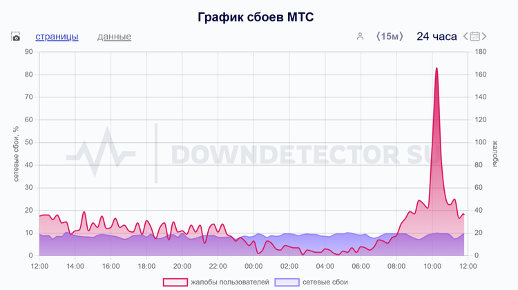 Пиковое число жалоб было зарегистрировано в 10:45 по московскому времени. Более 160 пользователей заявили о проблемах с интернет-соединением и мобильной связью.