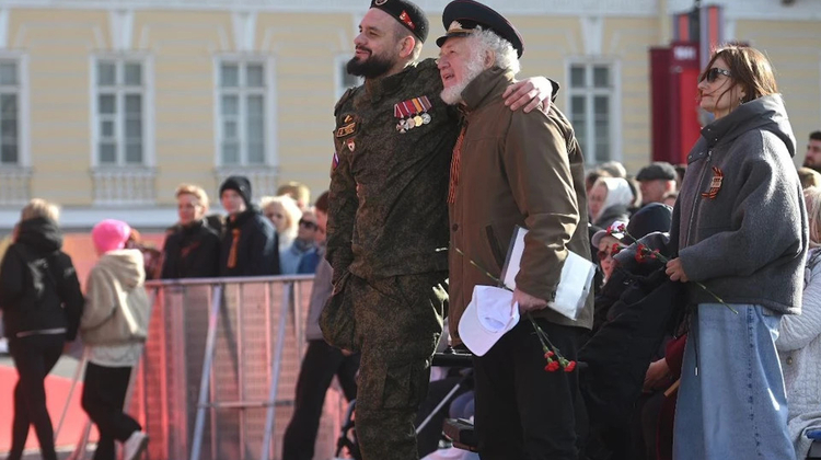 В Петербурге на концерте ко Дню Победы на Дворцовой площади журналисты сайта KP.RU запечатлели трогательный момент: потомок героя ВОВ помог встать ветерану СВО с инвалидной коляски во время исполнения гимна.
